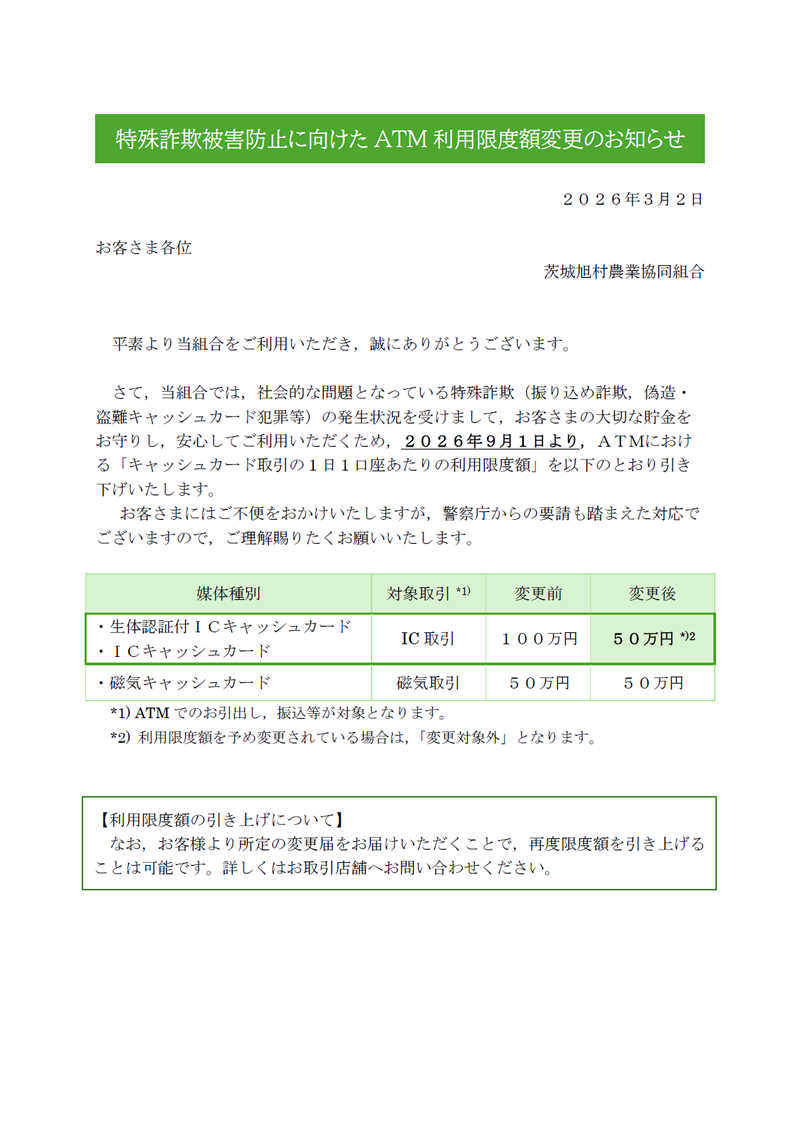 特殊詐欺被害防止に向けたATM利用限度額変更のお知らせ